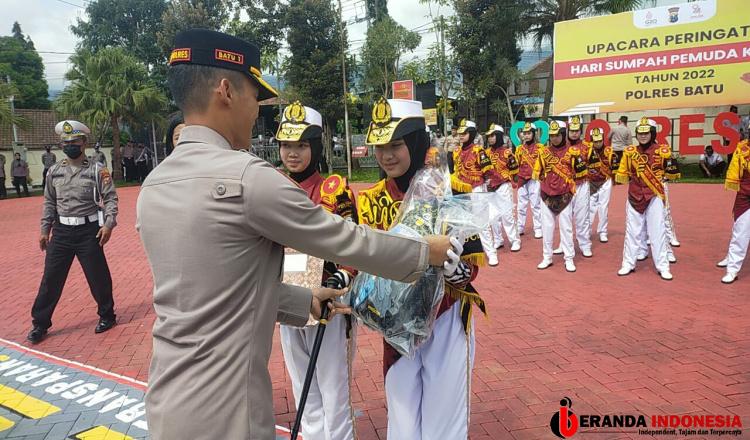 BATU – Kapolres Batu AKBP Oscar Syamsuddin memberikan penghargaan kepada Siswa-siswi dari anak-anak SDN Nganglik 1 yang tergabung dalam Polisi Cilik (Pocil), peraih 2 prestasi sekaligus dalam Lomba Pocil yang diselenggarakan Direktorat Lalu Lintas Polda Jatim, di halaman Mapolres Batu, Senin (31/10/2022).