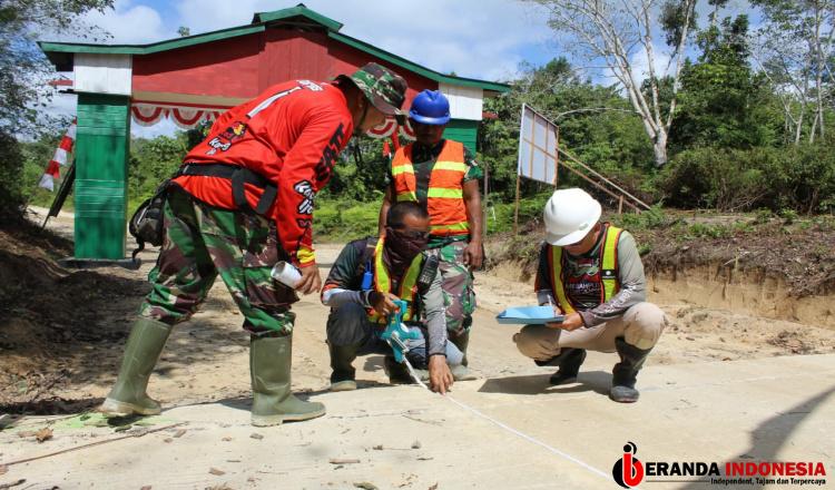 KUTAI BARAT – Tim pengawas lapangan Dinas Pekerjaan Umum dan Penataan Ruang (DPU-PR) Kabupaten Kutai Barat (Kubar) Helmi Muklis, didampingi Bintara perancang lapangan Serka Marno Saptono selaku satgas TMMD ke-113 Kodim 0912 Kubar, melakukan pengecekan volume semenisasi jalan yang telah di kerjakan oleh anggota satgas TMMD, Selasa (07/06/2022).