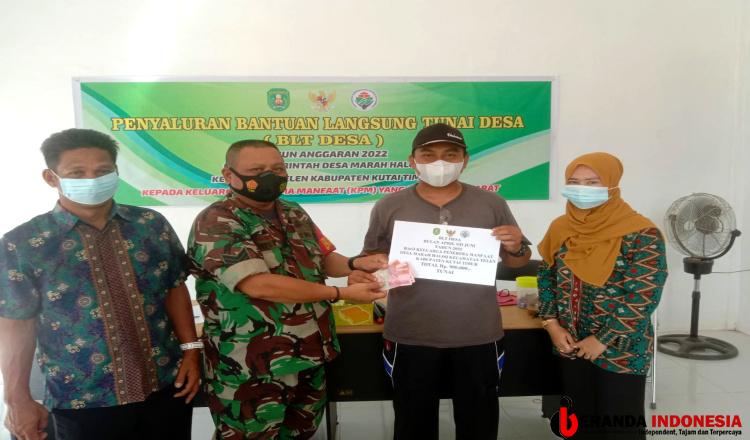KUTAI TIMUR – Babinsa Desa Marah Haloq, Serda Harianto, melaksanakan pengawalan penyerahan Bantuan Langsung Tunai Dana Desa (BLT DD) kepada masyarakat pra sejahtera di Kantor Desa Marah Haloq.