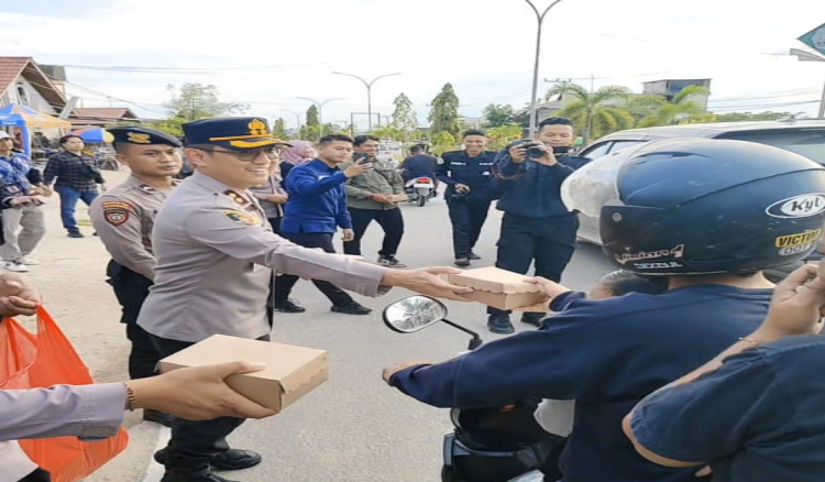 Sebelum acara buka puasa bersama, Kapolres Kutai Timur bersama jajarannya dan sejumlah wartawan membagikan ratusan kotak takjil kepada pengendara motor di simpang empat Jalan AW Syahranie, Sangatta, sekitar pukul 17.00 WITA.