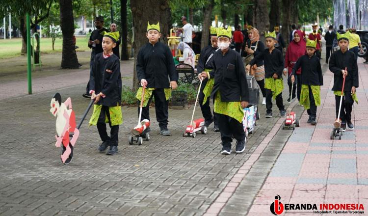 Festival Memengan yang berlangsung di Taman Blambangan, Sabtu (23/7) kemarin, berlangsung meriah. Ragam permainan tradisional dimainkan dan didefilekan oleh ratusan anak. Mulai dari egrang, congklak, bakiak, jaranan, hoola hoop, hingga bedhil-bedhilan (tembak-tembakan).