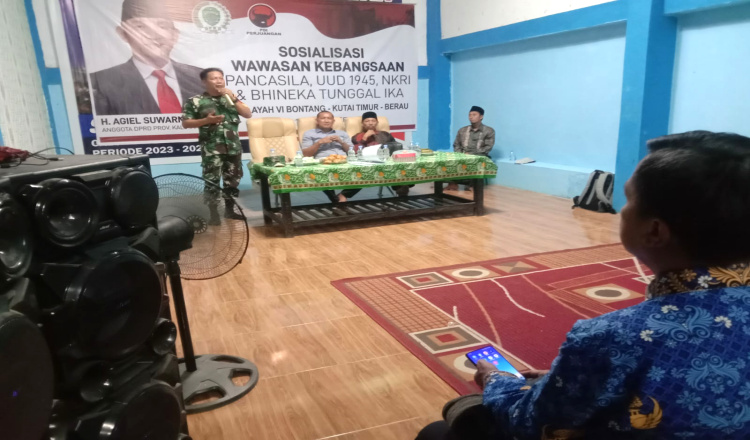 KUTAI TIMUR – Danramil 0909-07 Teluk Pandan, Kapten Inf Sajani Lumbantoruan, menghadiri dan aktif menjadi pemateri dalam sosialisasi yang diselenggarakan oleh anggota DPRD Provinsi, Agiel Suwarno, terkait materi wawasan kebangsaan kepada masyarakat Desa Suka Rahmat, Kecamatan Teluk Pandan, Selasa (29/11/2022).