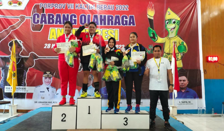 BERAU – Atlit Angkat Besi kelas Putri sumbang 3 Emas, 3 perak dan 8 Perunggu untuk Kabupaten Kutai Barat (Kubar) pada ajang Pekan Olahraga provinsi (Porprov) Ke-VII Kalimantan Timur (Kaltim) yang di helat di gedung Busak Malur Tanjung Redep Kabupaten Berau 2022, Rabu (30/11/2022).