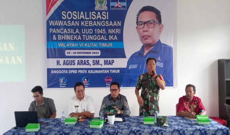 KUTAI TIMUR – Demi memperkuat jiwa nasionalisme para generasi muda khususnya bagi Saka Wira Kartika, Danramil 0909-07 Teluk Pandan, Kapten Inf Sajani Lumbantoruan melakukan pemberian materi wawasan kebangsaan kepada siswa SMAN 1 Teluk Pandan dalam kegiatan Sosialisasi Wawasan Kebangsaan yang dilaksanakan oleh Anggota DPRD Provinsi, Agus Aras.